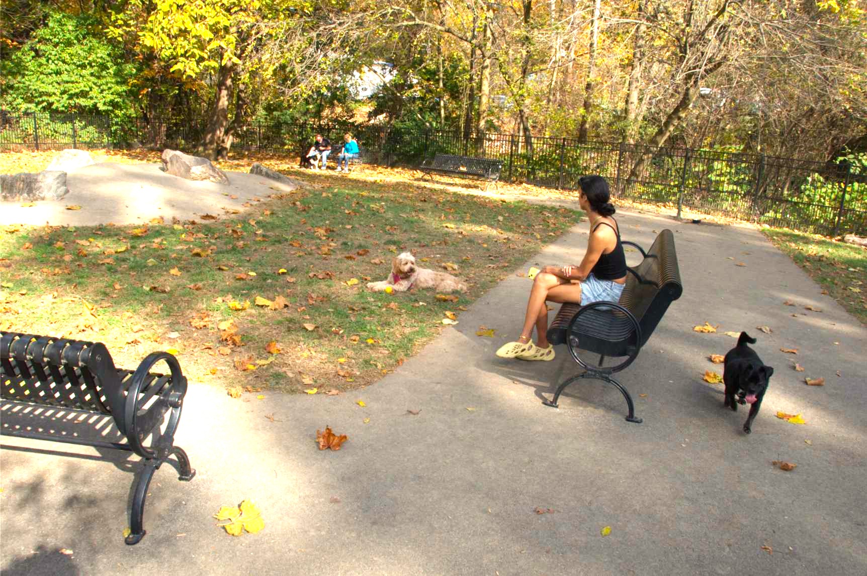 A woman sits on a black bench as a black dog and brown dog are nearby in the dog park on the Karl Stirner Arts Trail in Easton, Pennsylvania.
