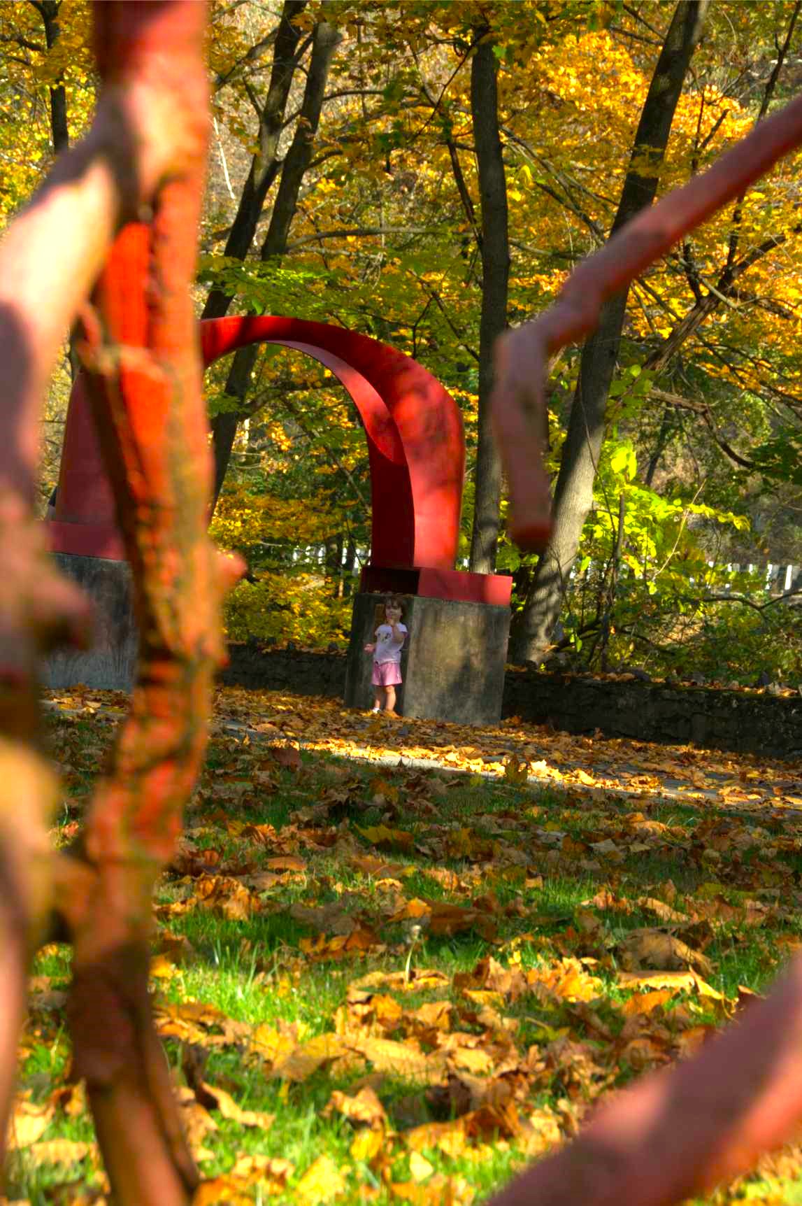 A child stands by the red arch sculpture on the Karl Stirner Arts Trail in Easton, Pennsylvania.